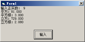 VB程序题:用InputBox 输入一个正实数,用Pring方法在一行上显示出它的平方和平方根、立方和立方根,每个数保留三位小数,其间有间隔。